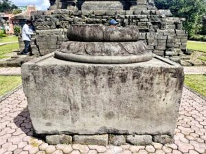 Brandes menyatakan jika arca ini dahulunya berada di ruang utama candi berdiri di atas teratai ganda yang ditopang lapik persegi yang kini masih terlihat pula di halaman candi, yang untuk detailnya mungkin akan kita bahas di lain lapak.