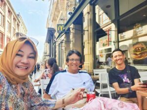 Nah, saat menjelang sore hari, saya berwisata ke jalan yang selalu ramai tersebut. Setelah lelah jalan-jalan, saya dan Lilies mampir minum di McD yang ada di perempatan jalan, berhadapan dengan Galeries Lafayette. Saya duduk di luar. Di sebuah sudut ada anak muda berwajah melayu sedang asyik main HP. Tiba-tiba…