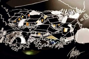 Saya pernah mendampingi dan menilai desa wisata di Godean. Begitu melihat tobong genteng, intuisi segera muncul dan saya sampaikan kepada para pengelola wisata. Ini bisa menjadi objek tour wisata bagi kalangan perkotaan. Itu yang meletup saat saya melihat sketsa perkampungan perajin genteng di Godean karya Hans. Konteks ditransformasikan ke dalam teks–sketsa–dengan indah dan terlihat karakter perkampungannya.