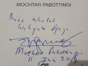 Klarifikasi itu beliau sampaikan karena dalam tulisan publikasi acara launching saya sebut sebagai sejarawan. Tentu, saya paham dengan jenjang pendidikan Bang Mochtar di Sastra Inggris UGM. Tetapi kemampuan beliau dalam mengurai dan menulis beragam tema–bagi saya–memiliki kekuatan historis yang sangat tinggi. Bahkan, ijazah S1 beliau yang menanda tangani Prof Sartono Kartidirdjo, Mahaguru Ilmu Sejarah UGM yang sangat beliau hormat kagumi.